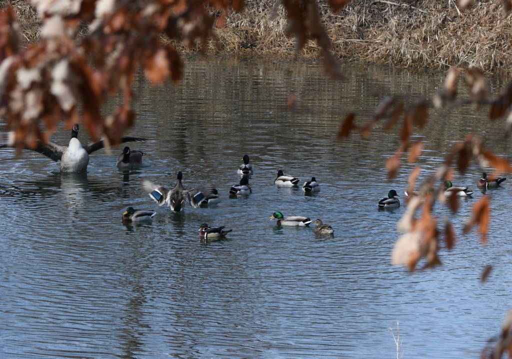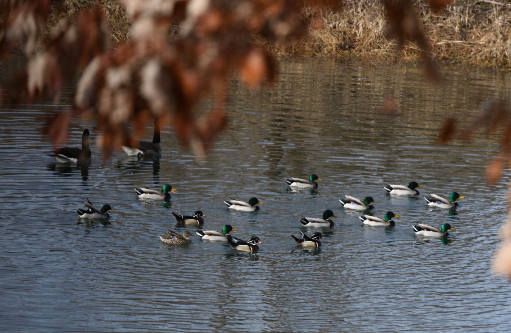 It was a call to action for the inhabitants on the pond. Into formation they went — geese, mallards, wood ducks — all working together. They stayed in this position hopefully to confuse? look larger? I don’t know…