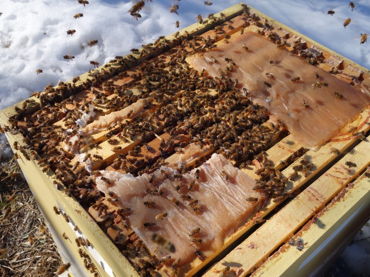 I went back to the hive in early March and found this. Their numbers had improved and they were nibbling on sugar patties — supplemental food source in case their own honey stores become low.
