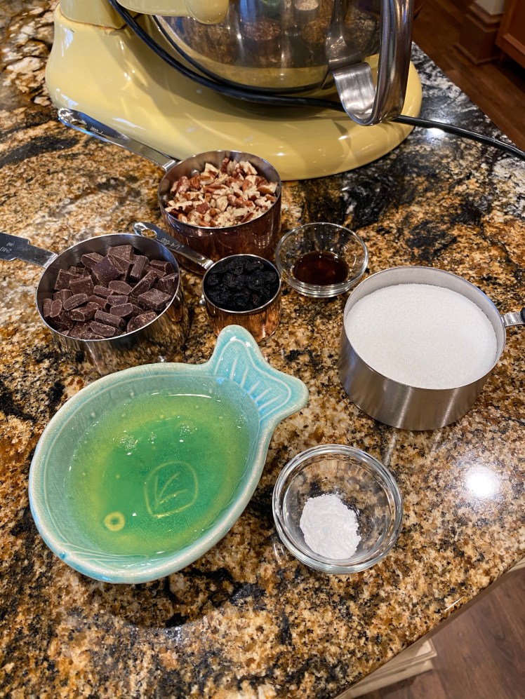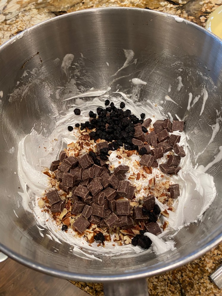 Two egg whites, 1/2 tsp. cream of tartar, 3/4 cup sugar, 1/2 tsp vanilla bean paste, 3/4 cup milk chocolate chunks, 3/4 cup chopped, toasted pecans, 1/4 cup dried blueberries. With the additives, you can change things up — if you like bittersweet chocolate, go ahead; if you like dried cherries, make the substitution, but keep the measurements the same.