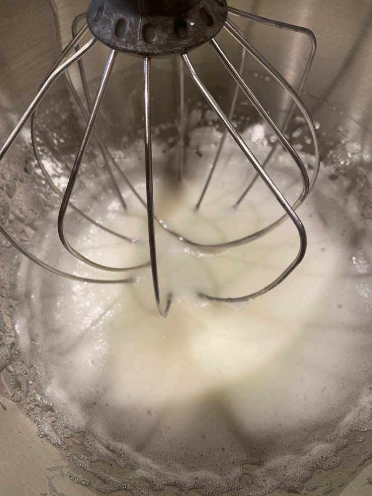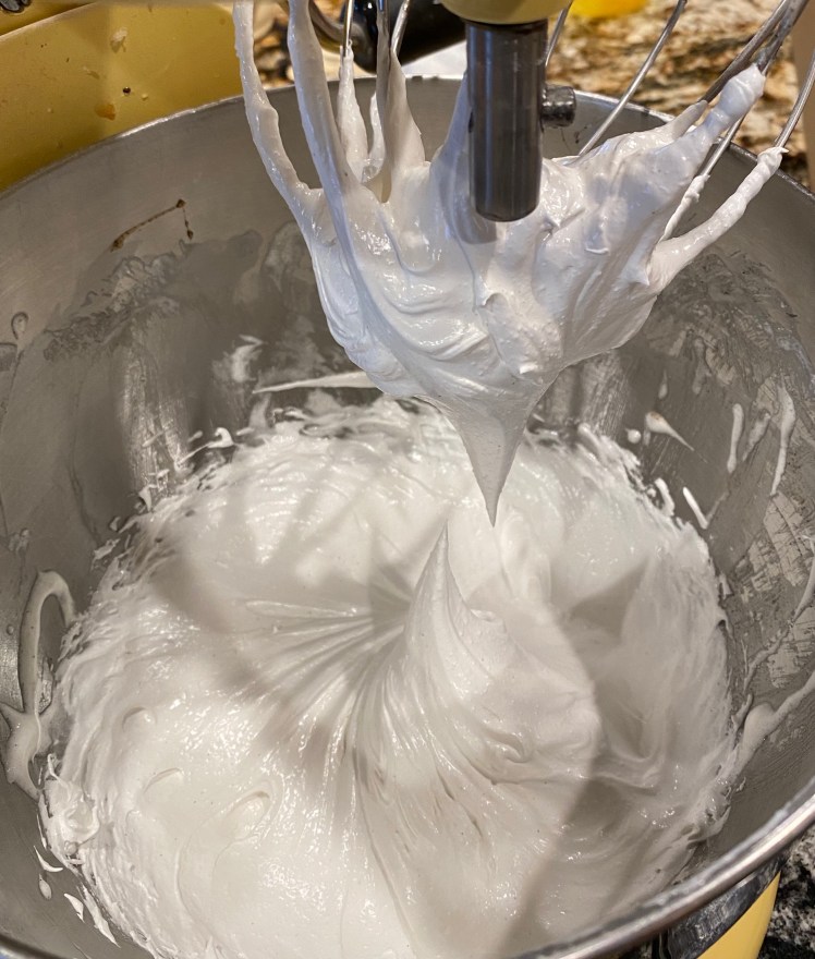 Add the egg whites and cream of tartar to a stand mixer (it’s easiest) and whip on medium until soft peaks form. Then slowly add the sugar and then the vanilla bean paste. (NOTE: I turn the mixer off to add the vbp — if you don’t, the balloon whisk shoots it all over the sides of the bowl instead of getting into the egg whites. Trust me, I’ve learned…). Whip on high speed until still peaks form. (I don’t give times for the whipping because everybody uses different types of mixers.)