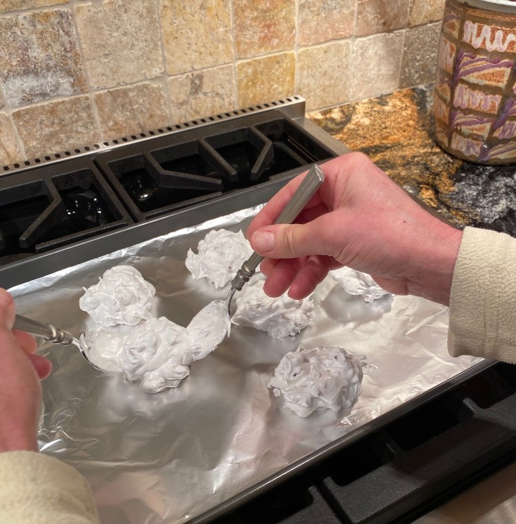 Take two spoons and drop 2-inch balls of the meringue mixture onto a foil-lined baking sheet. Recipe makes 18, but my cookies are larger and make 12-14.