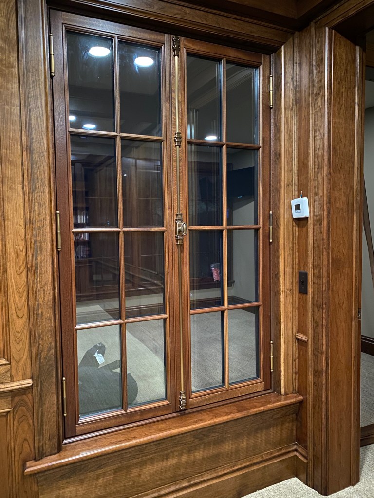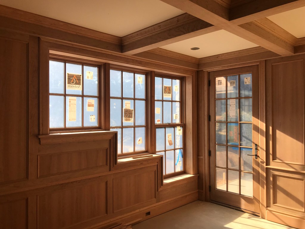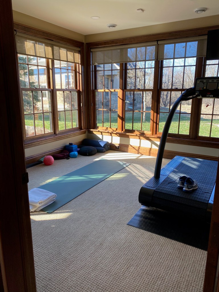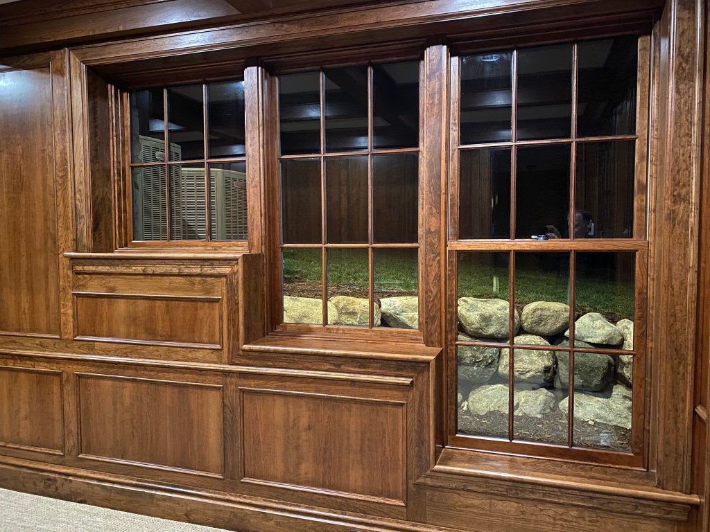 Like the main level, there was a hallway extension. This provided access to a new mechanical and storage room, an exercise room and Phil’s study. New carpeting was laid throughout the lower level and the ceilings were sanded down, like the main level, to smooth. New doors, window and door casings, and base moldings, also like the main level, were replaced.