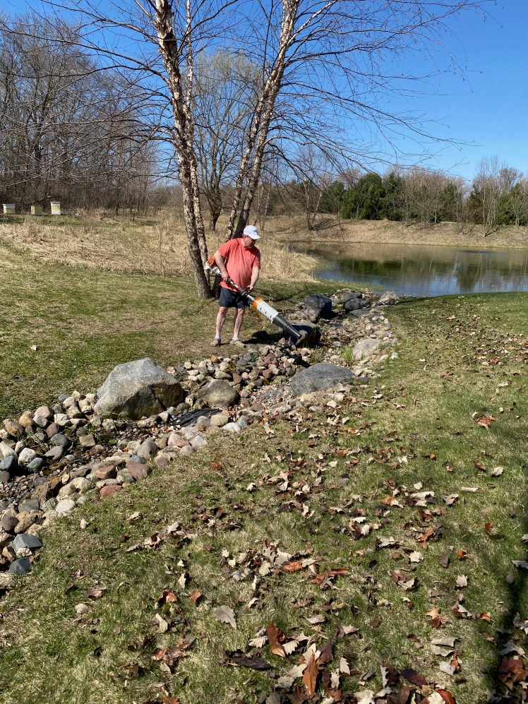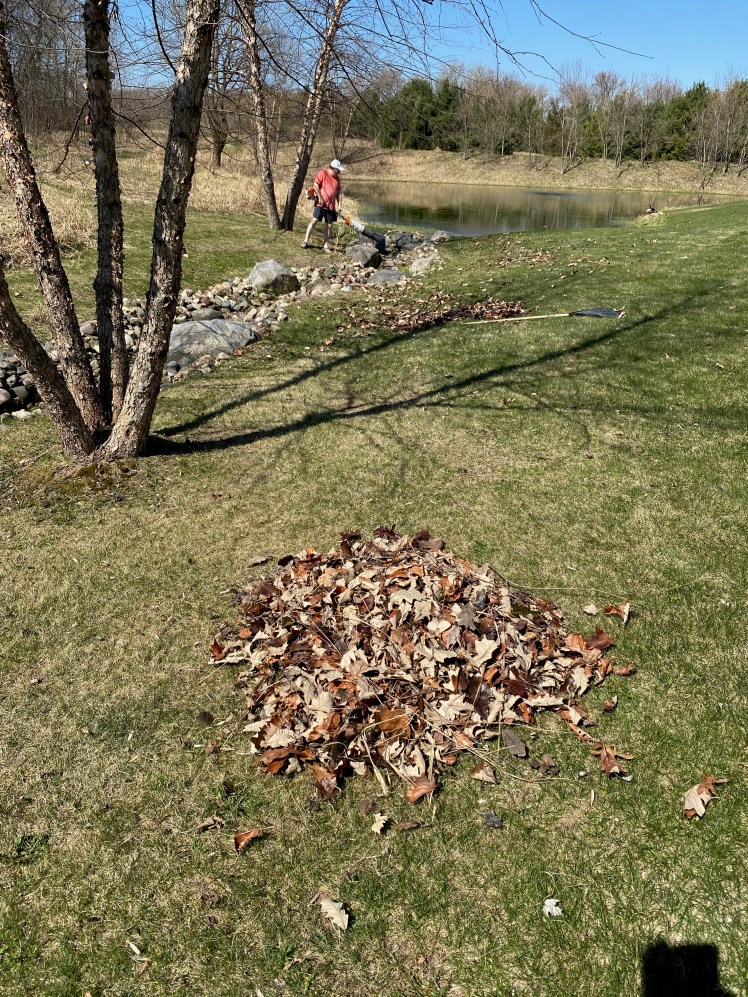 My husband blew the leaves out of the bottom of the bed and crannies of rocks onto the grass. I then raked them into piles and put them in the back of my utility vehicle.