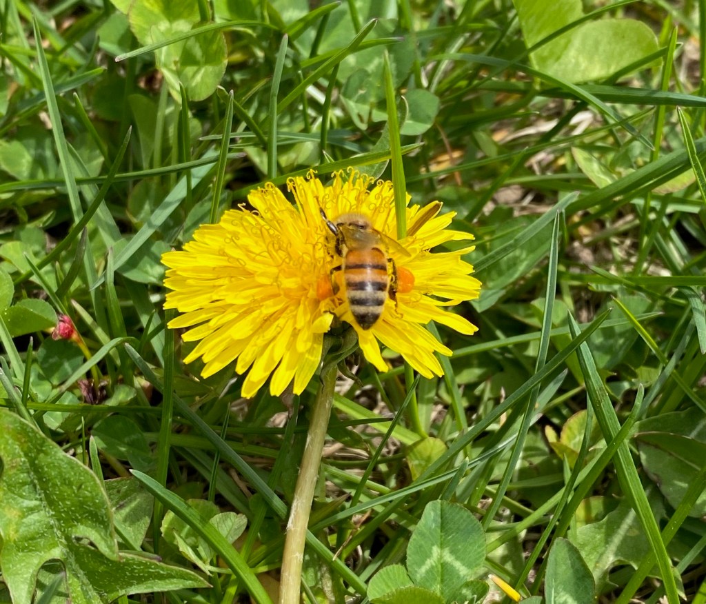 Dandelions have whipped up quickly “on the slope.” I leave them there because…I think they are lovely in that space and…it is a great pollen source for the honeybees.