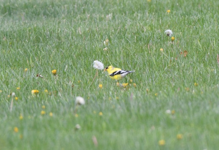 Maybe even more-so, on a dull, dreary, cool day like today, that inextinguishable yellow of the male goldfinch cannot be missed. Streaking through the yard, flitting from branch to grass to feeder at such a pace that they are hard to photograph, I watched as one male settled in the grass by a silky dandelion flower.