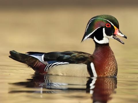 It is easy to become mesmerized by the wood duck. They are a gorgeous duck with intricate plumage. The male has iridescent chestnut and green coloring, a crested head, bold markings and ornate patterns on almost every feather. The female, although not as flashy, has warm brown plumage with a grayer, slightly crested head. A striking white teardrop surrounds the eyes.
