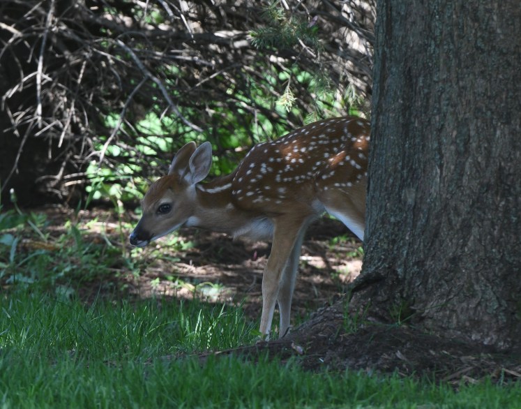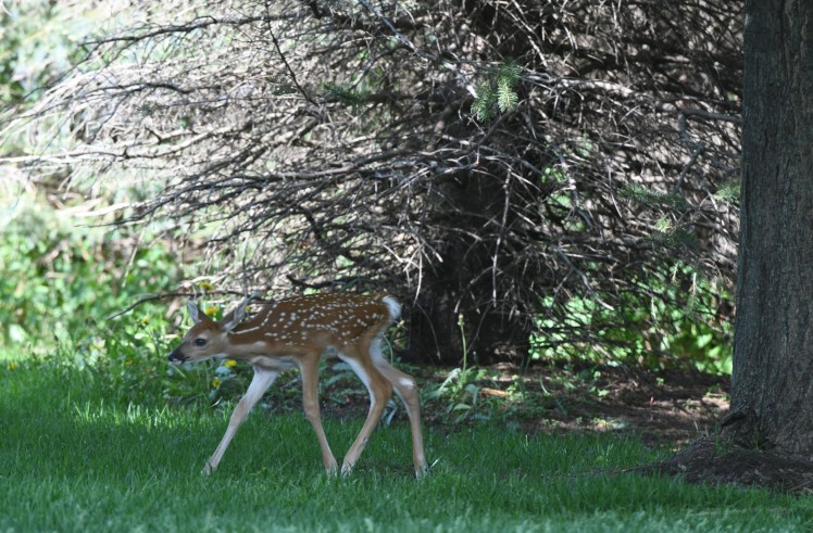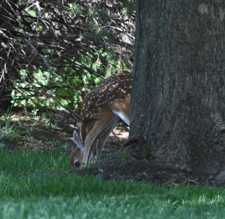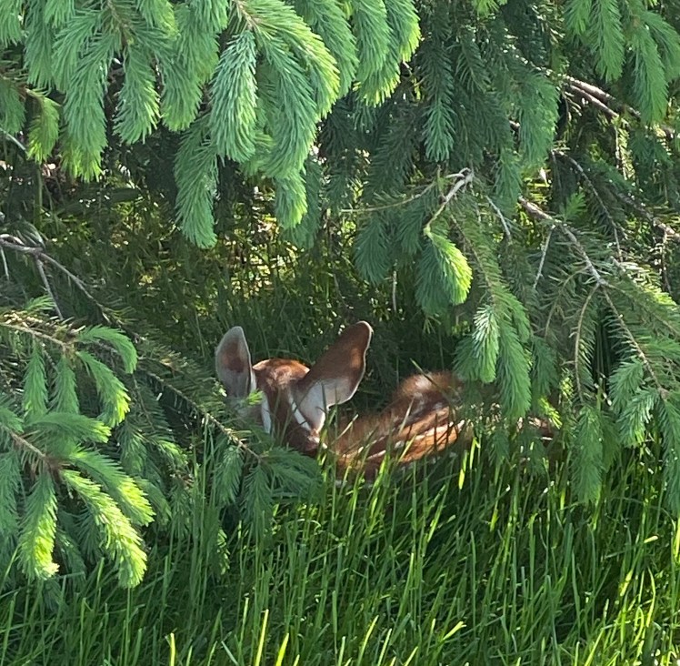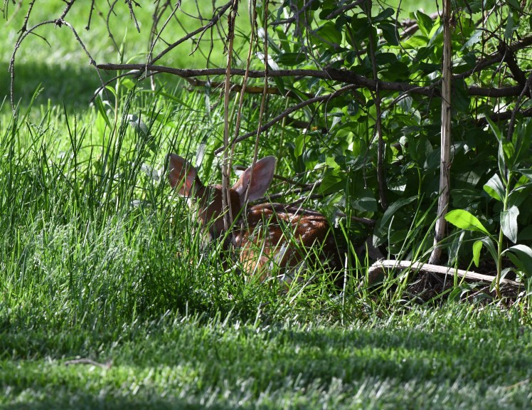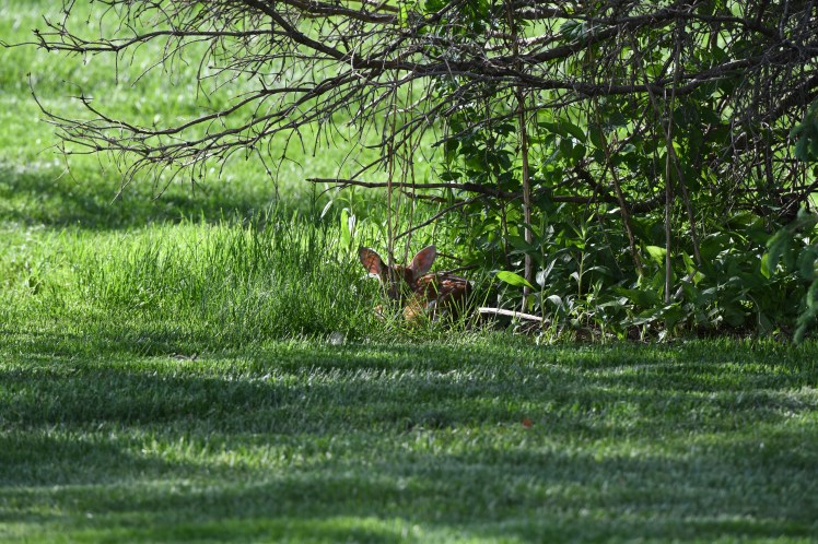 Well, what an afternoon with Beatrice! She was being so good, staying in her spot until too much noise seemed to spook her. My lawnmower guys came and I told them to keep a wide berth. They kept a very wide berth and Bea did not seem to mind. But then my neighbor started to mow his yard, etc., etc., and in an instant she was up and running, or as fast as her new legs would take her. I was mortified. I felt if she kept running she’d never make it back to the spot where her mother left her.