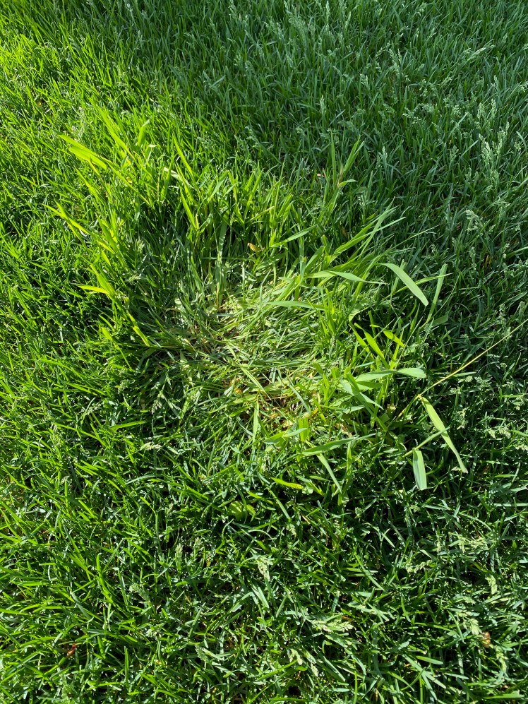 I told my mowers, who were almost finished, to leave until next time, and asked my neighbor to stop for a while. Fortunately, Beatrice ran to our front tree island — evergreens, crabapples, hydrangeas, so good coverage, and collected herself. She started sniffing around, maybe trying to get her bearings.