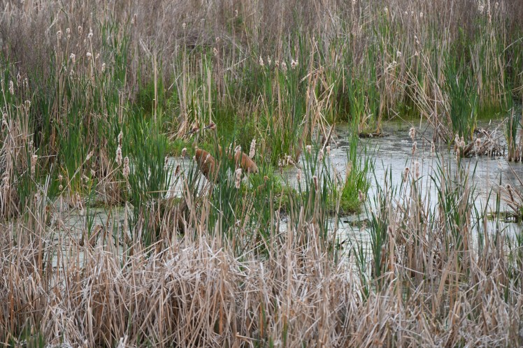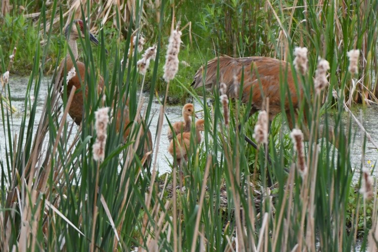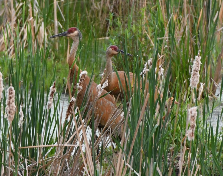 I have a very good friend, Lori, who lives down the street from me, same neighborhood. Part of this neighborhood is claimed by a large! pond and marshy area. Lori and her family are lucky enough to live, just past the groomed backyard, on this marshland. Although the open water has been crowded out by cattails, that does have it’s advantages. Boggy areas and muskrat mounds dot the watery landscape, creating the perfect nesting spots for the Sandhill Crane. Meanwhile, the cattails provide shelter and camouflage.