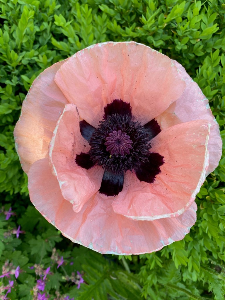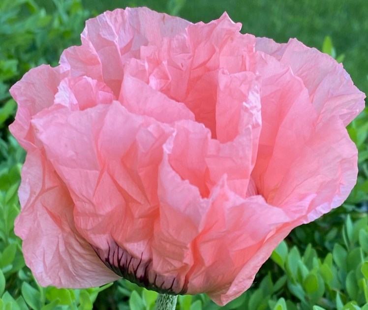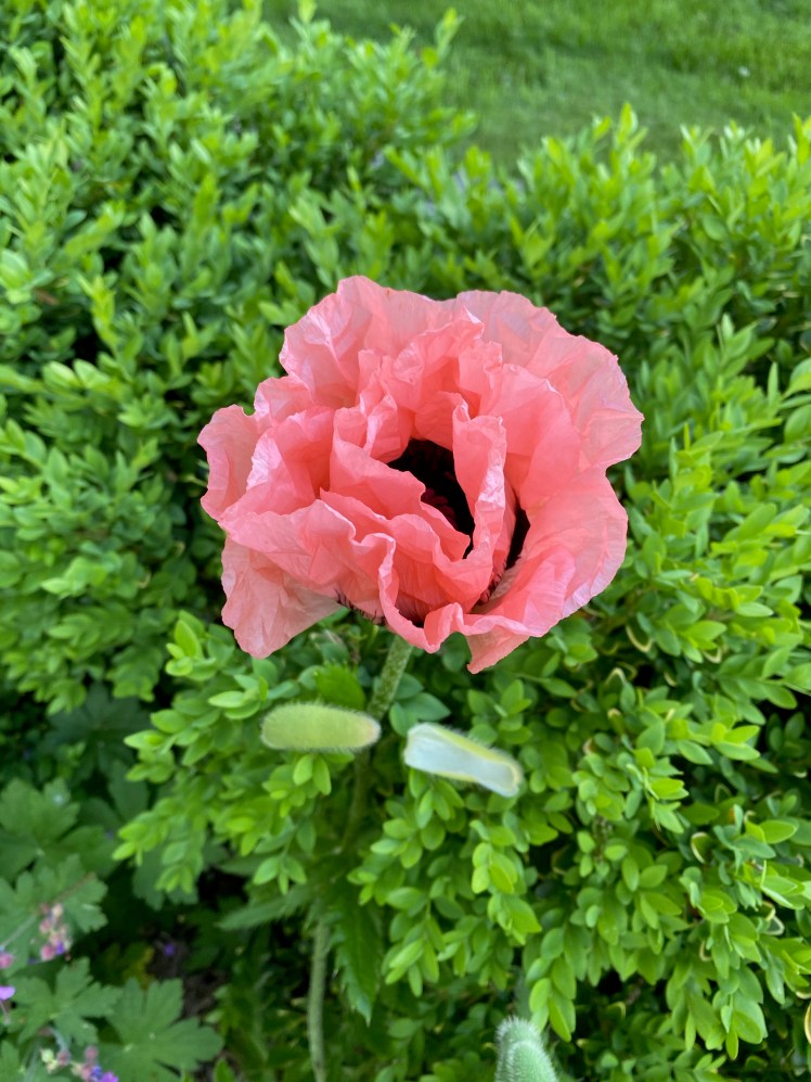 Take this year for example. I have one poppy in a flower bed and this year it is actually blooming (none last year), with four more buds to go. I’ve had two days with it — watching it open and standing proudly over the tops of its boxwood backdrop.