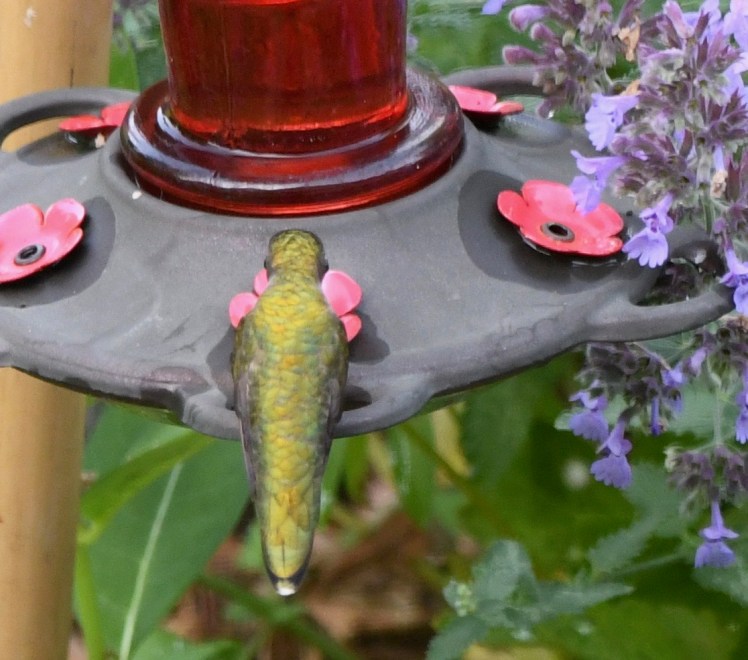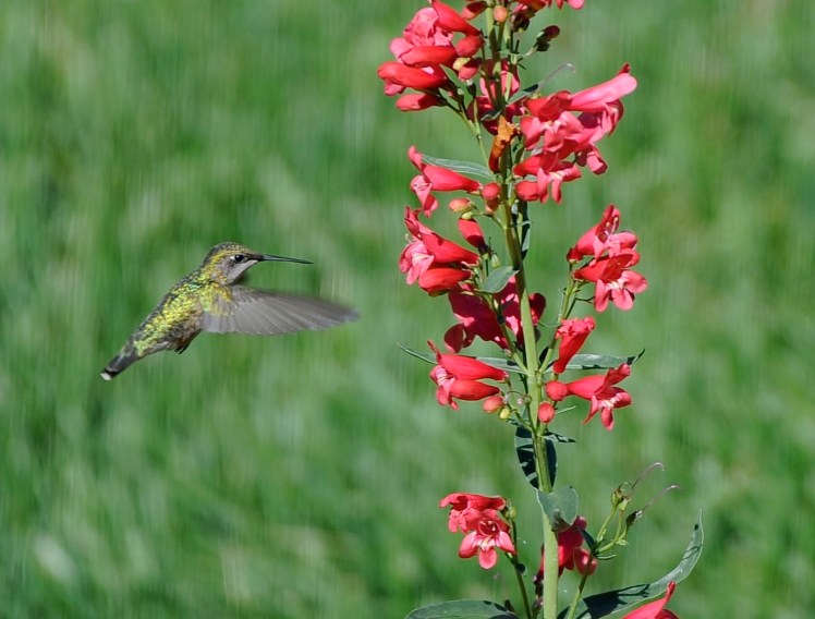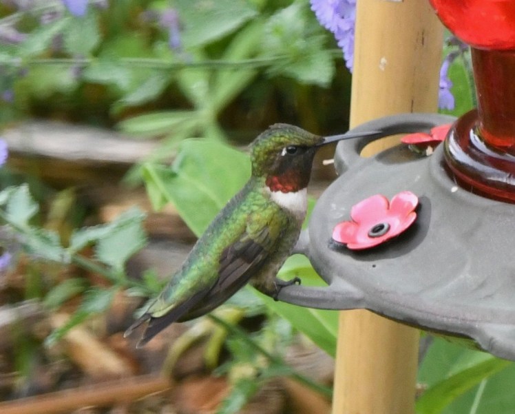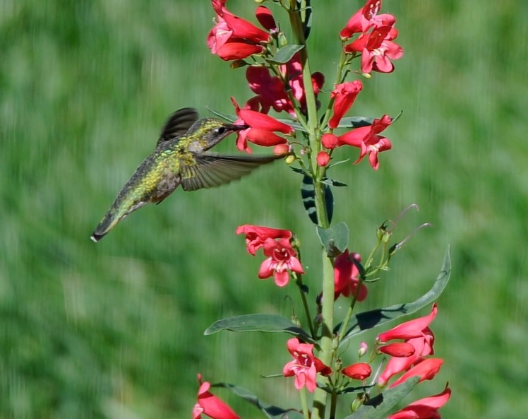 Sometimes as they zip through the sky, I mistake them for dragonflies. That is not long lived, though, once my eye follows the speedy sprite to its destination — nectar-producing flowers. Hovering and sipping, they move from flower to flower gobbling up the nectar.