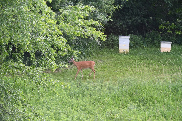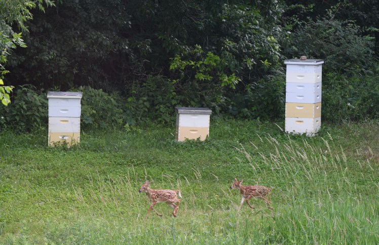 A couple of days ago, towards the dinner hour, I was looking out the kitchen windows when I saw a doe out by the bee yard. We keep the bee yard mowed down and also mow paths in the grasses so we can take walks. It also helps me see the goings-on that takes place on those paths. But behind her I saw movement. Practically tripping over my husband I readied the camera. Sure enough, two brown, speckled, long-legged fawns! The joy!