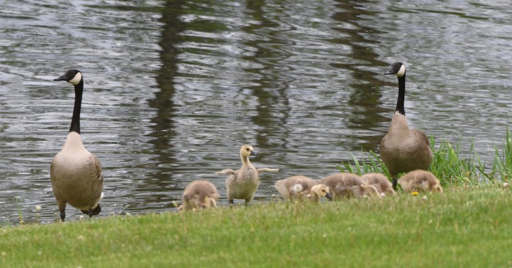 But then I noticed the distinct pattern of parents flanking their offspring. Sure enough, it was the family that stayed on the pond most of the spring. Certainly not much difference in appearance to their parents except for size, the offspring stayed together while the parents kept a still watchful eye.