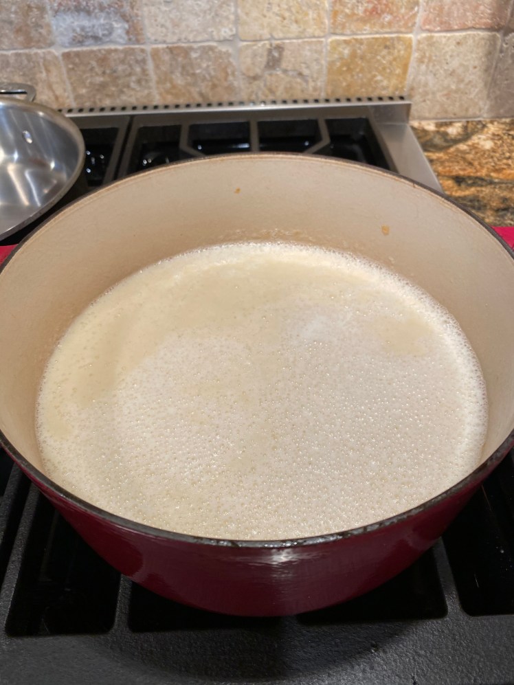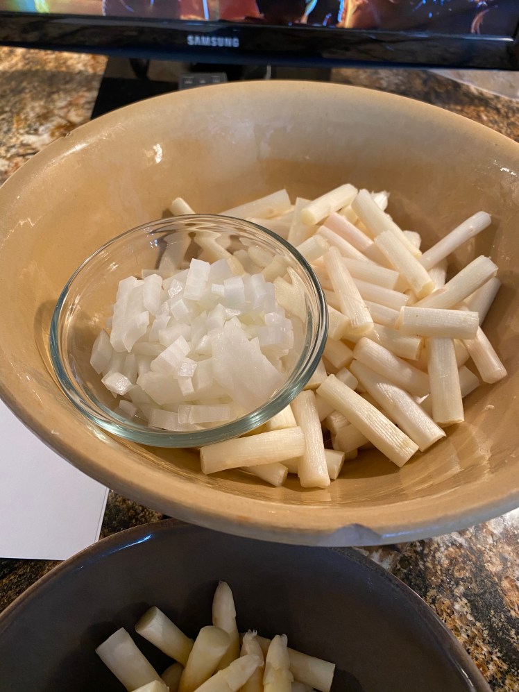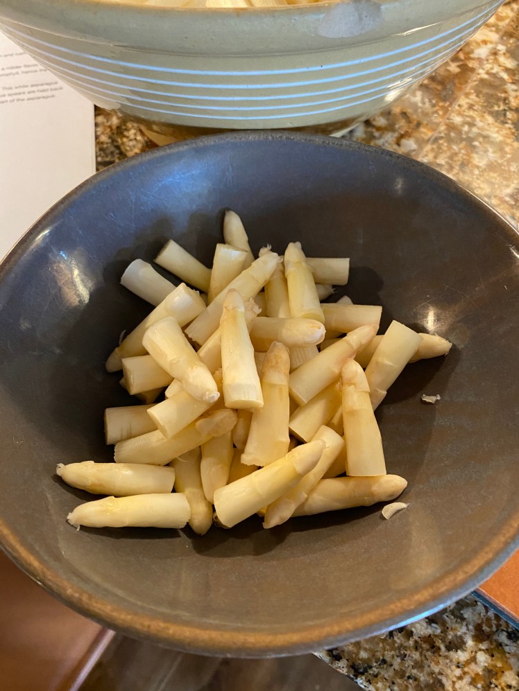 1 1/2 – 2 lbs white asparagus, peeled and cut into two inch pieces, heads reserved in separate bowl (I used two pounds to increase the asparagus flavor).