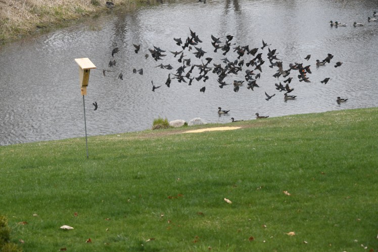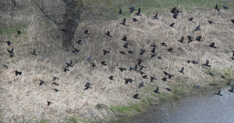 Assuredly one of the biggest flocking of birds to the yard — a sure sign of Spring — is the return of the red-winged blackbirds. Bold and noisy, sitting atop tree tops in bundles, flying through the sky in flocks, they seem determined to disrupt the harmonious and serene scenes of the ducks and geese floating quietly on the pond and resting peacefully on the banks.