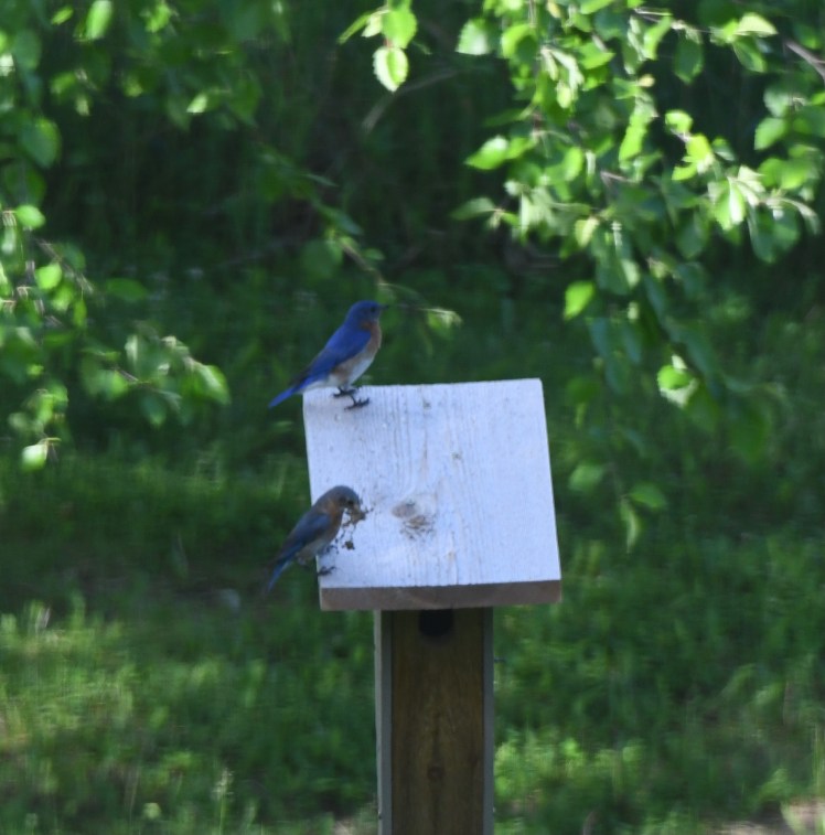And they spent no time settling into the only bluebird house left — swallows and chickadees took up the other three boxes. It was after Memorial Day weekend. I did not see the “streak,” but did see a bird on top of the lone empty house,